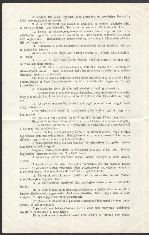 1927 Pécs szabad királyi város közönségének tulajdonát vevő mezőszéli városi kislakásos lakótelep, valamint a városi szükséglakások házirendje.4p. Hajtva