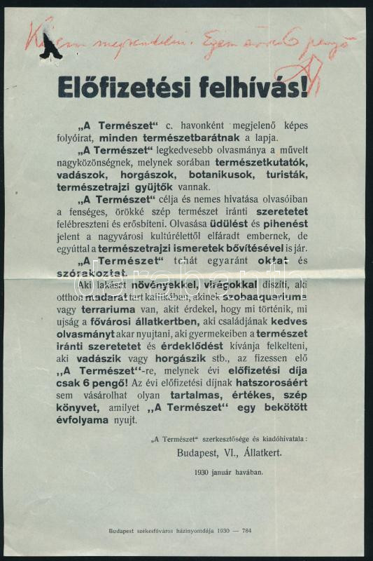 Leírás: 1930 Előfizetési felhívás a "Természet" című képes folyóiratra a Budapesti Állatkerti Szerkesztőség kiadásában