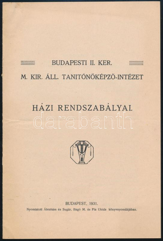 1931 Budapesti II. ker. M. kir. áll. tanítónőképző-intézet házi rendsz... https://www.darabanth.com/hu/471-Gyorsarveres/471.0/Mutargy-papirregiseg-egyeb/Nyomtatvanyok~1000015/1931-Budapesti-II-ker-M-kir-all-tanitonokepzo-intezet-hazi-rendszabalyai-Bp-1931-C3~II3025229