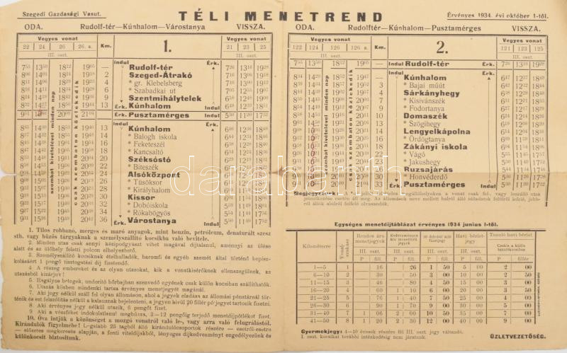 Leírás: 1934 Szegedi Gazdasági Vasút téli menetrend, hajtva, kis szakadásokkal, 33,5x21 cm
