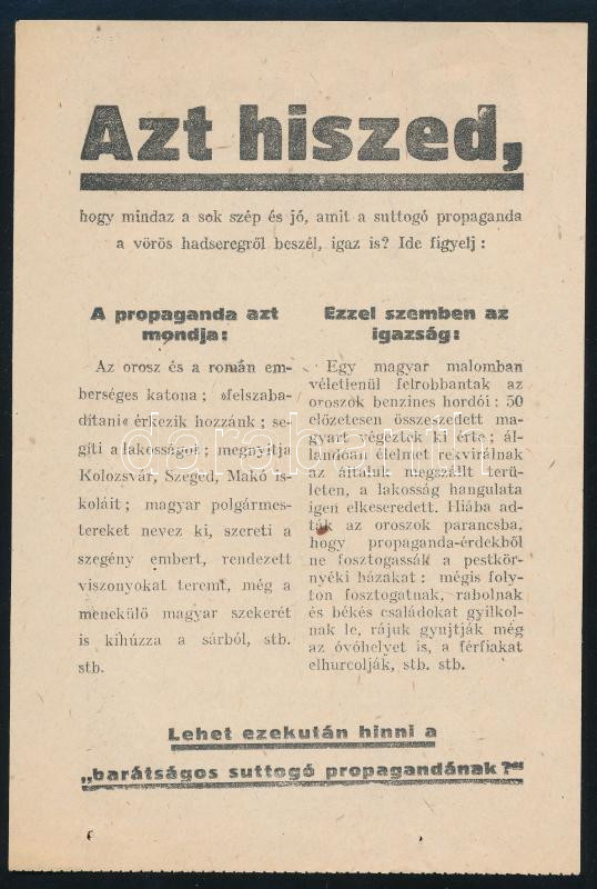 Leírás: 1944 ,,Azt hiszed, hogy mindaz a sok szép és jó, amit a suttogó propaganda a vörös hadseregről beszél, igaz is?", II. világháborús röplap, 21x14 cm