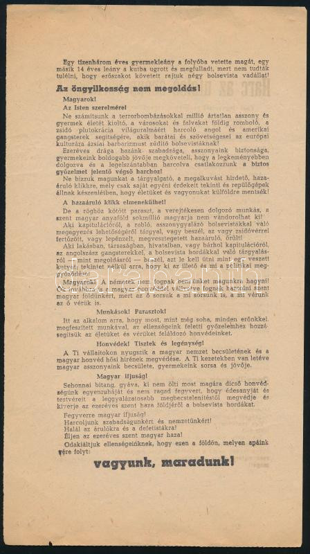 1944 ,,Mottó: Inkább hős egy pillanatig, mint rabszolga egy életen át. Harc az utolsó csepp vérünkig!", II. világháborús nyilas röplap, kétoldalas, apró lapszéli szakadásokkal, 25,5x14 cm