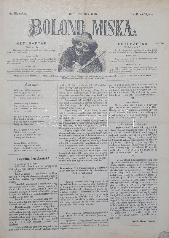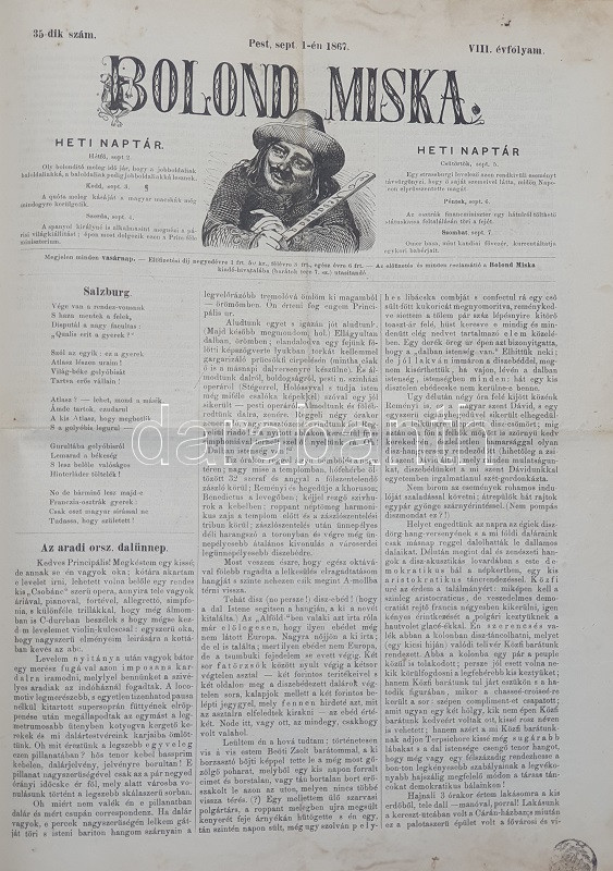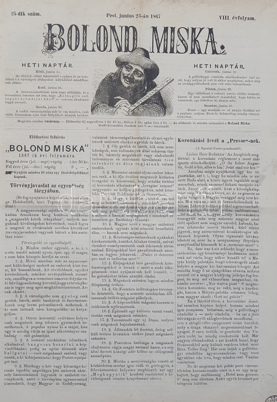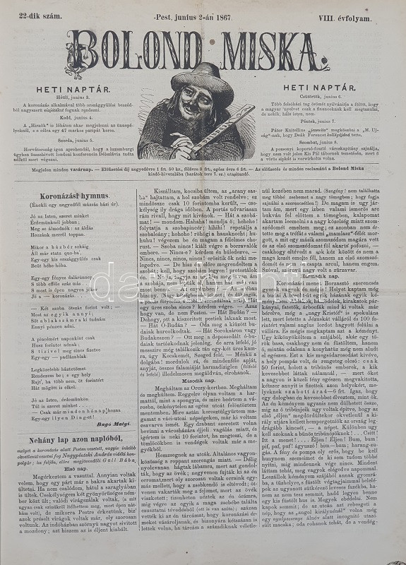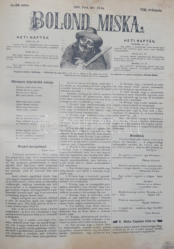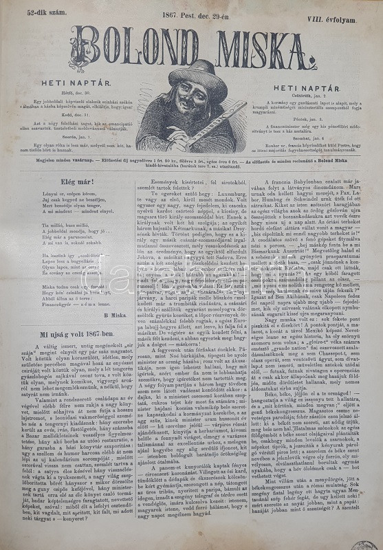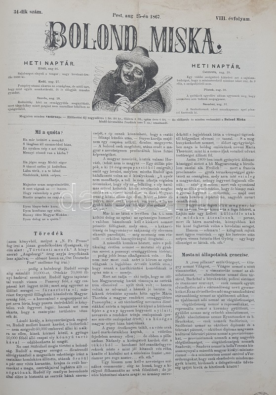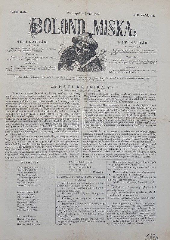Bolond Miska. [Képes élclap.] Megjelenik minden vasárnap. Felelős szerkesztő Tóth Kálmán. Rajzolja Jankó [János]. VIII. évfolyam, 1-52. szám. (1867. január 6. - 1867. december 29.) [42 lapszám, egybekötve.] Pest, 1867. Emich Gusztáv ny. 28 + 61-68 + 75-208 (helyesen 209) + [1] p. Folio. A Bolond Miska képes élclap Tóth Kálmán (1831-1881) költő, drámaíró, szerkesztő humorisztikus hetilapja volt. A markáns politikai tartalommal bíró humorisztikus hetilap 1860-1875 között jelent meg, ellenzéki hangvétellel. Népszerűségéhez jelentősen hozzájárult 1862. évi betiltása, valamint írói gárdájának kétségtelen rátermettsége. Az álnevek alatt futó verses, prózai és bohózati darabokat a lap legnépszerűbb éveiben Ágai Adolf, Csernátoni Lajos, Lauka Gusztáv, P. Szathmáry Károly, Tóth Kálmán jegyezték, a lap illusztrátora a politikai karikatúra nagymestere, Jankó János volt. A lap fénykora a kiegyezés körüli időkhöz kötődik, ám Tóth Kálmán szerkesztő politikai irányváltása, ellenzékiből kormánypártivá válása sokat ártott a lapnak, előfizetői példányszáma így jelentősen csökkent. A lap jellegzetes szemszögű és nyelvezetű zsánerfigurákat teremtett, a hazafi Bolond Miskát, a nemesi Vecseri de Vecseri levélírót, a mindig éles nyelvű Garaboncás diákot, a német adminisztráció világmagyarázóját, Kipfelhauser Adolfot, a zsidó levélíró és kommentátor típusaként Spicig Itziget. A lapszámok négy oldal terjedelműek, minden szám utolsó oldalán aktuális politikai témákat tárgyaló karikatúrák. Tárgyévünk lapszámainak karikatúrái a kiegyezés jelentette politikai felbolydulás költségvetési, bel- és külpolitikai, egyházügyi és nemzetiségi kérdéseit járják körül. A 1-6. és a 44-52. lapszám japán papírral javítva. Gyűjteményünkből a 8-16. és a 18. lapszám hiányzik., néhány levélen apró szakadásnyom. Példányunk fűzése megerősítve. XX. század elejéről származó, hiányos gerincű kartonkötésben. Jó példány.
