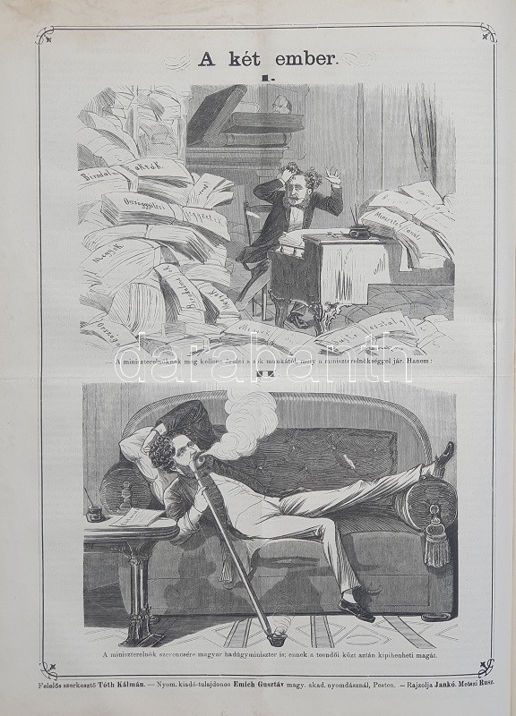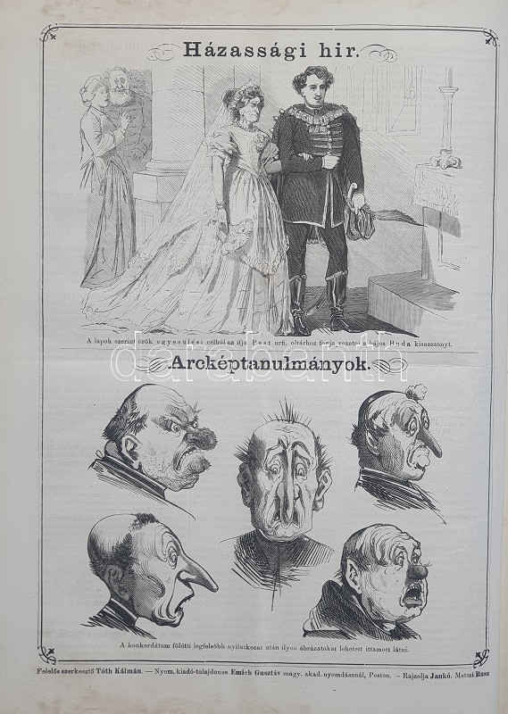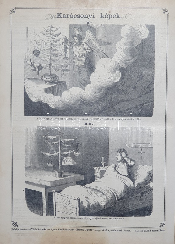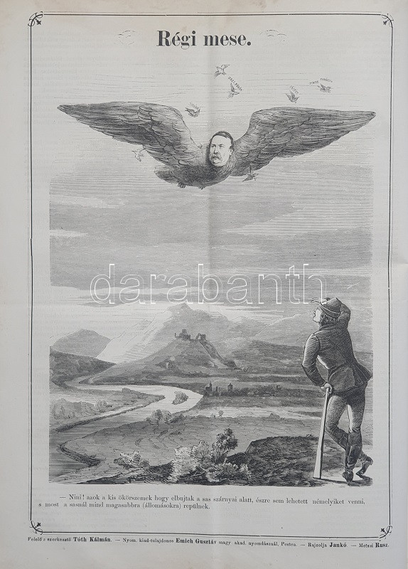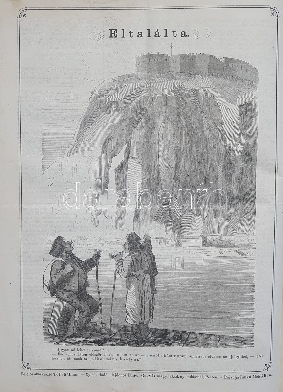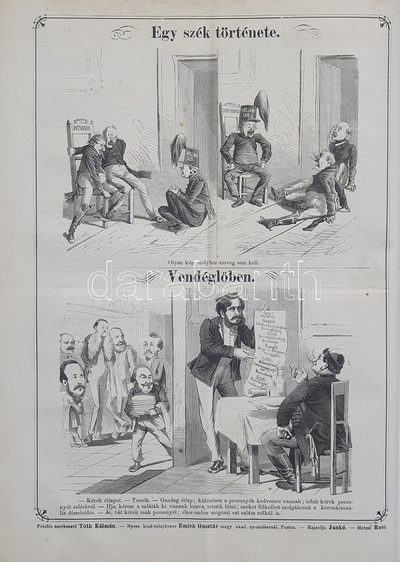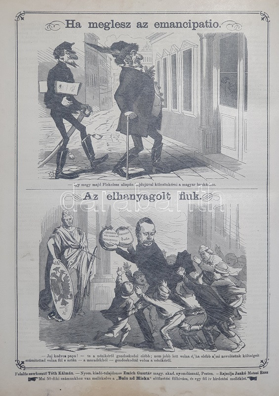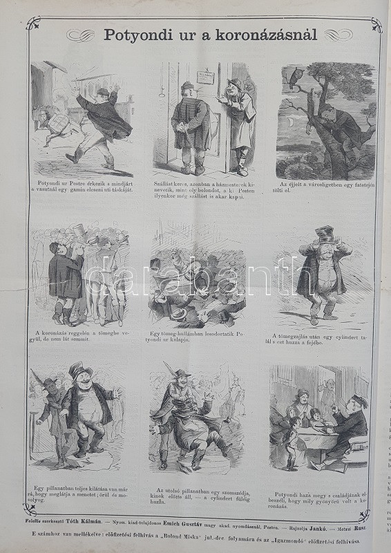 Bolond Miska. [Képes élclap.] Megjelenik minden vasárnap. Felelős szerkesztő Tóth Kálmán. Rajzolja Jankó [János]. VIII. évfolyam, 1-52. szám. (1867. január 6. - 1867. december 29.) [42 lapszám, egybekötve.] Pest, 1867. Emich Gusztáv ny. 28 + 61-68 + 75-208 (helyesen 209) + [1] p. Folio. A Bolond Miska képes élclap Tóth Kálmán (1831-1881) költő, drámaíró, szerkesztő humorisztikus hetilapja volt. A markáns politikai tartalommal bíró humorisztikus hetilap 1860-1875 között jelent meg, ellenzéki hangvétellel. Népszerűségéhez jelentősen hozzájárult 1862. évi betiltása, valamint írói gárdájának kétségtelen rátermettsége. Az álnevek alatt futó verses, prózai és bohózati darabokat a lap legnépszerűbb éveiben Ágai Adolf, Csernátoni Lajos, Lauka Gusztáv, P. Szathmáry Károly, Tóth Kálmán jegyezték, a lap illusztrátora a politikai karikatúra nagymestere, Jankó János volt. A lap fénykora a kiegyezés körüli időkhöz kötődik, ám Tóth Kálmán szerkesztő politikai irányváltása, ellenzékiből kormánypártivá válása sokat ártott a lapnak, előfizetői példányszáma így jelentősen csökkent. A lap jellegzetes szemszögű és nyelvezetű zsánerfigurákat teremtett, a hazafi Bolond Miskát, a nemesi Vecseri de Vecseri levélírót, a mindig éles nyelvű Garaboncás diákot, a német adminisztráció világmagyarázóját, Kipfelhauser Adolfot, a zsidó levélíró és kommentátor típusaként Spicig Itziget. A lapszámok négy oldal terjedelműek, minden szám utolsó oldalán aktuális politikai témákat tárgyaló karikatúrák. Tárgyévünk lapszámainak karikatúrái a kiegyezés jelentette politikai felbolydulás költségvetési, bel- és külpolitikai, egyházügyi és nemzetiségi kérdéseit járják körül. A 1-6. és a 44-52. lapszám japán papírral javítva. Gyűjteményünkből a 8-16. és a 18. lapszám hiányzik., néhány levélen apró szakadásnyom. Példányunk fűzése megerősítve. XX. század elejéről származó, hiányos gerincű kartonkötésben. Jó példány.