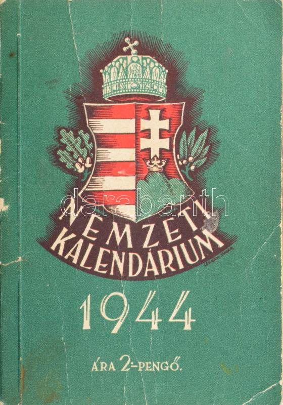 Nemzeti Kalendárium 1944. Szerk.: Dr. Mindszenti Béla. Bp., (1944), Nemzeti Könyvtár, 7 sztl. lev.+ 296 p. A borító Légrády Sándor munkája. Kiadói papírkötés, kissé viseltes borítóval, helyenként sérült lapokkal, ceruzás bejegyzésekkel.