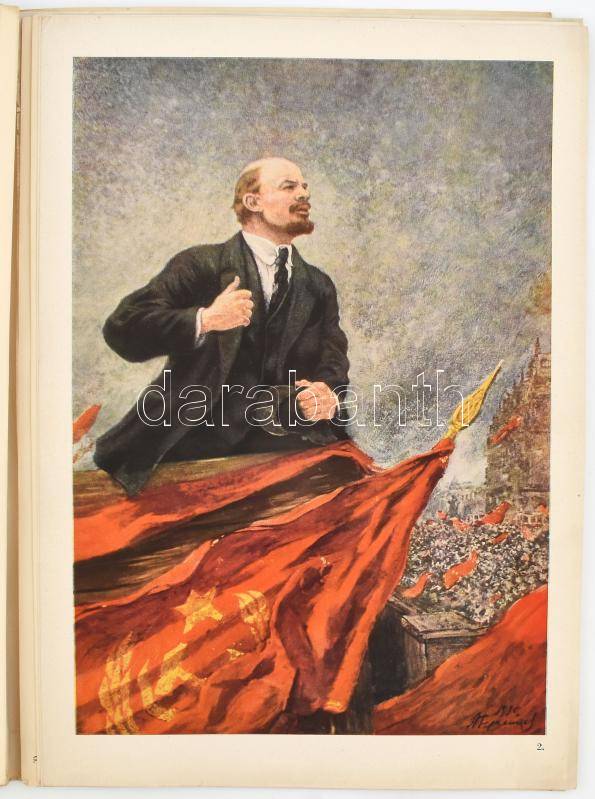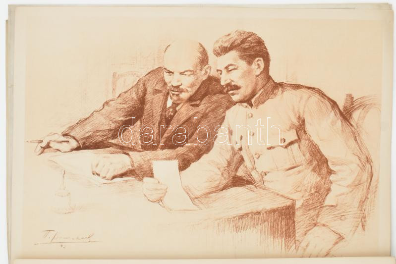 cca 1950 V. I. Lenin, mappa 10 db képpel (ebből 3 színes), kiadja: Művészeti Alkotások N.V. (A mappa egyik eredeti képe hiányzik, helyére egy Sztálin-portré került.) Kiadói papírmappában, 34x24 cm.