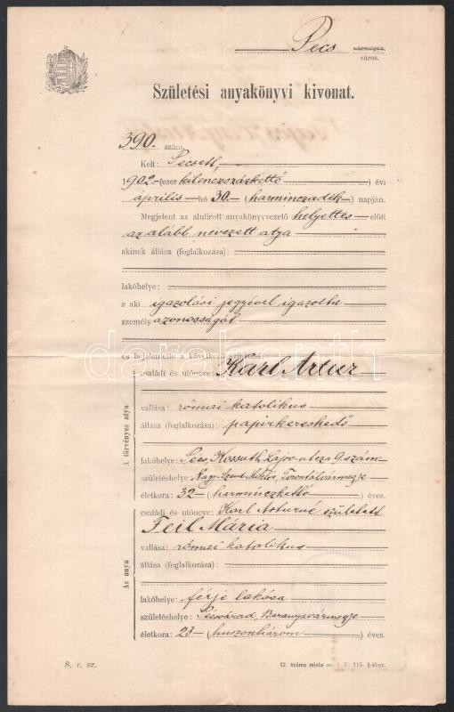 1919 Születési anyakönyvi kivonat 1908-as 1K Pécsi városi illetékbélyg... https://www.darabanth.com/hu/471-Gyorsarveres/471.0/Mutargy-papirregiseg-egyeb/Okmanyok~2000107/1919-Szuletesi-anyakonyvi-kivonat-1908-as-1K-Pecsi-varosi-illetekbelyggel~II3146258