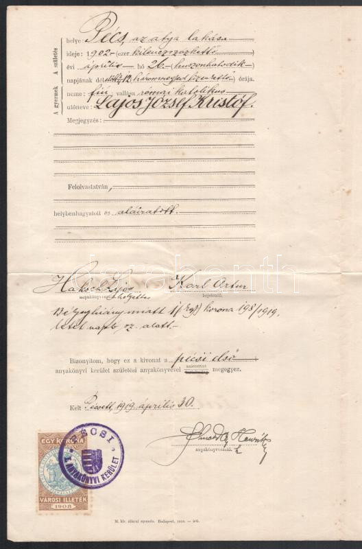 Leírás: 1919 Születési anyakönyvi kivonat 1908-as 1K Pécsi városi illetékbélyggel