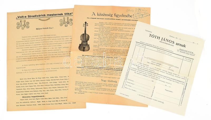 1933-1943 Bp., 3 db-os tétel Tóth János művész és hangversenyhegedű készítő mester elért sikereiről, a hegedűkészítés rejtelmeiről és egy kitöltetlen számla