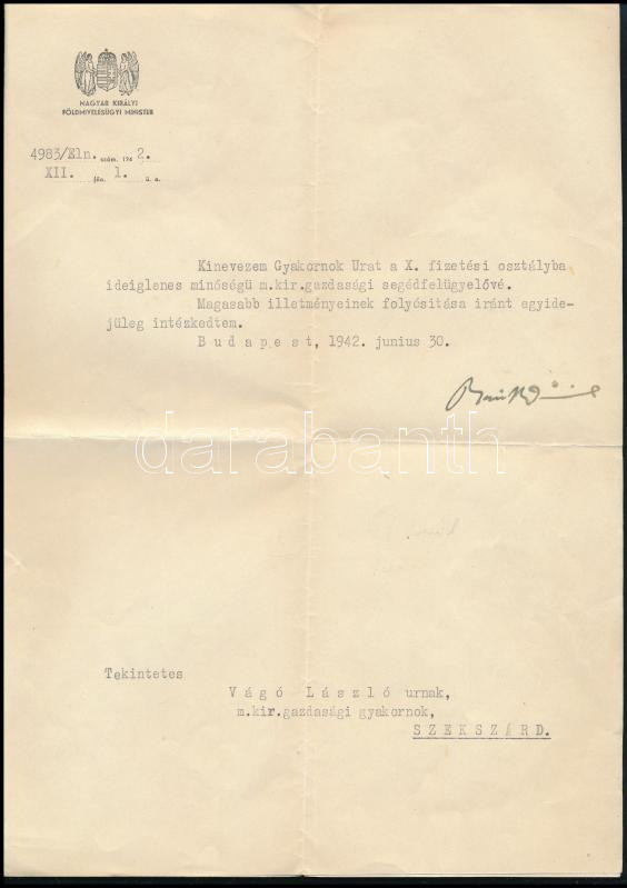 Leírás: 1942 báró Bánffy Dániel (1893-1955) földművelésügyi miniszter által saját kézzel aláírt kinevezési okmány, fejléces papíron, hajtásnyommal