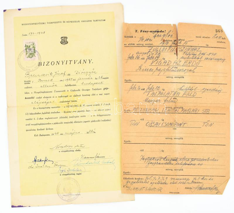 Leírás: 1948-50 2db mozihoz kapcsolódó okmány: 1948 mozigépkezelői bizonyítvány Brunszvik József részére, 10 Ft illetékbélyeggel, beazonosítandó aláírásokkal + 1950 Zuglói Filmszínház megrendelőlapja moziplakátokról, szakadt