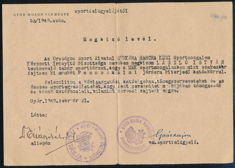 1949 Győr, Országos Sport Hivatal Munkára Harcra Kész Sportmozgalom Központi Irányító Bizottsága nevében kiállított megbízólevél testnevelő tanár részére a pannonhalmi járásra kiterjedő hatáskörrel, Győr-Moson vármegye alispánjának autográf aláírásával és bélyegzőjével, fejléces papíron, apró szakadásokkal, hajtva