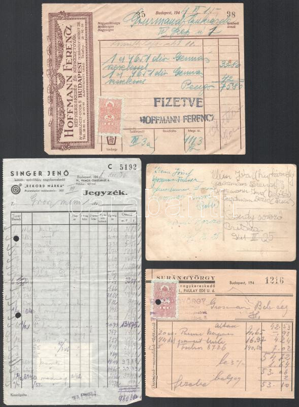 cca 1910-41 Bp., össz. 4 db okmány és 1 db fotólap: Hoffmann Ferencz képkereskedés és képkeretgyár; Surán György; Singer Jenő kötött-, szövöttáru nagykereskedő; Deutsch Károly-örökösei, bizonyítvány házmester részére; Szondy söröző, Britannia szálló belső társasággal, hátoldalán autográf aláírásokkal, feltehetően Grossmann cukrászda tulajdonosai