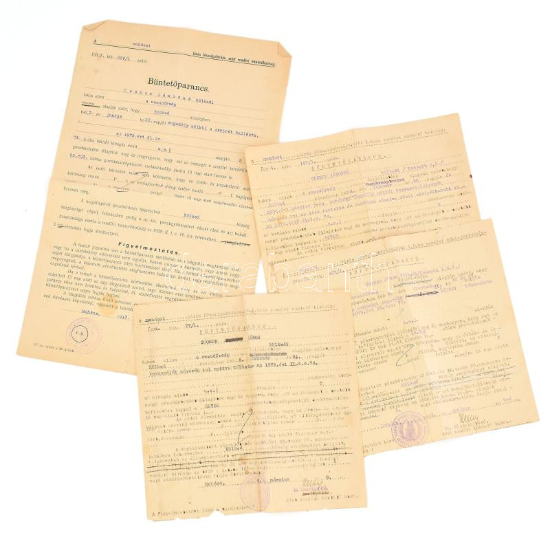 cca 1933-35 Mohács, kölkedi kocsmáros ellen kiállított 4 db csendőrség... https://www.darabanth.com/hu/471-Gyorsarveres/471.0/Mutargy-papirregiseg-egyeb/Okmanyok~2000107/cca-1933-35-Mohacs-kolkedi-kocsmaros-ellen-kiallitott-4-db-csendorsegi-buntetoparancs-ki~II3188730
