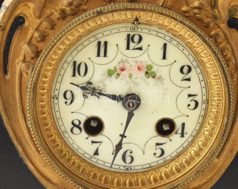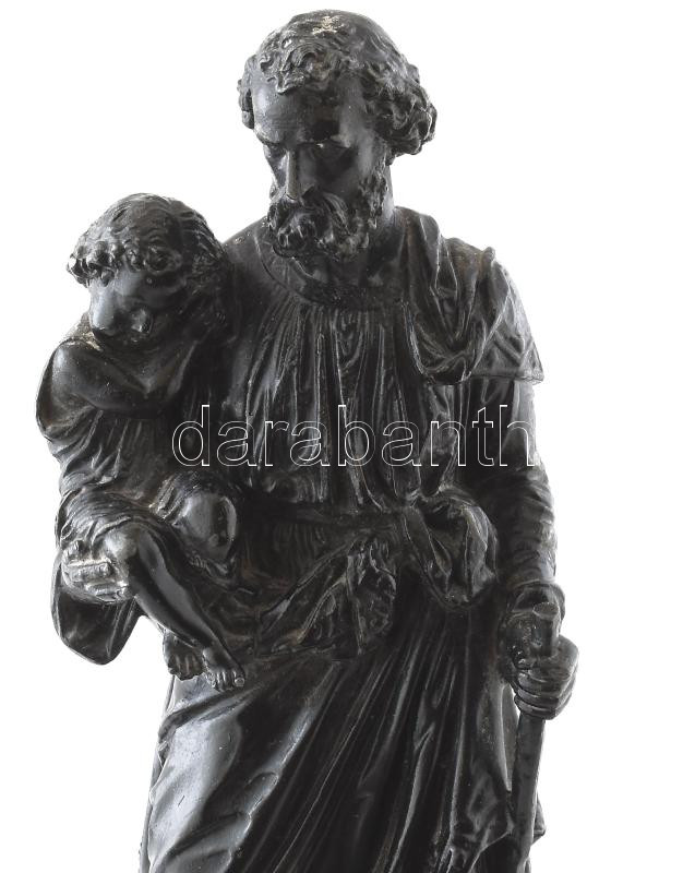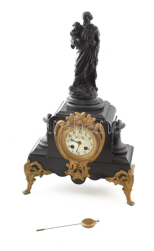 Antik kandallóóra, javítással, pótlással, hiánnyal, tetején vas Szent József alakkal,feltehetően Franciaország, kulcs nélkül, ingája megvan, 33x15x52 cm