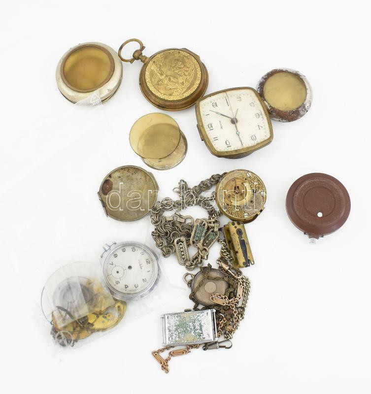 Leírás: Vegyes óra és óraalkatrész tétel: régi zsebóra tokok, szerkezet, óraláncok, retró vekker, karóra, stb.