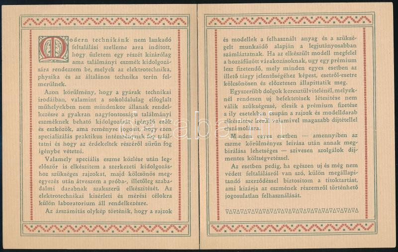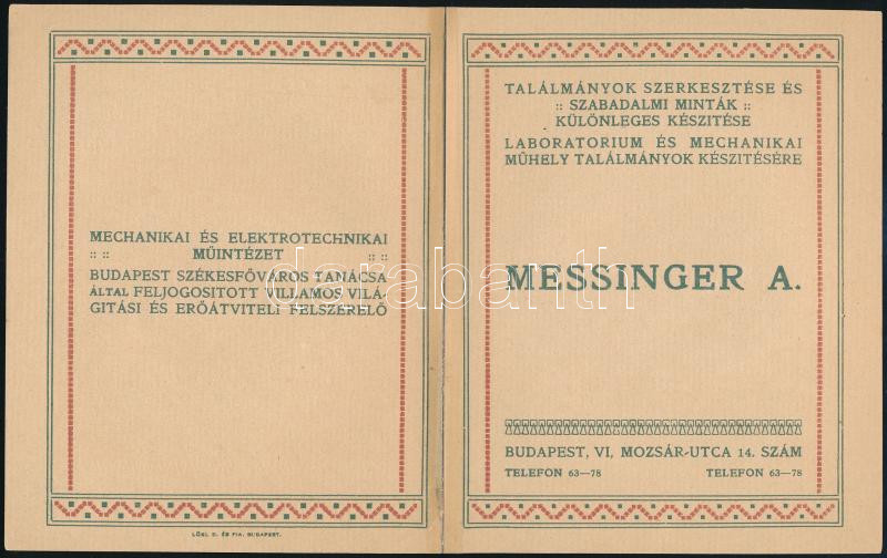 1913 Messinger A. budapesti cégének nyitható reklámkiadványa, melyben elektrotechnikai, mechanikai találmányok szerkesztését, minták elkészítését vállalja