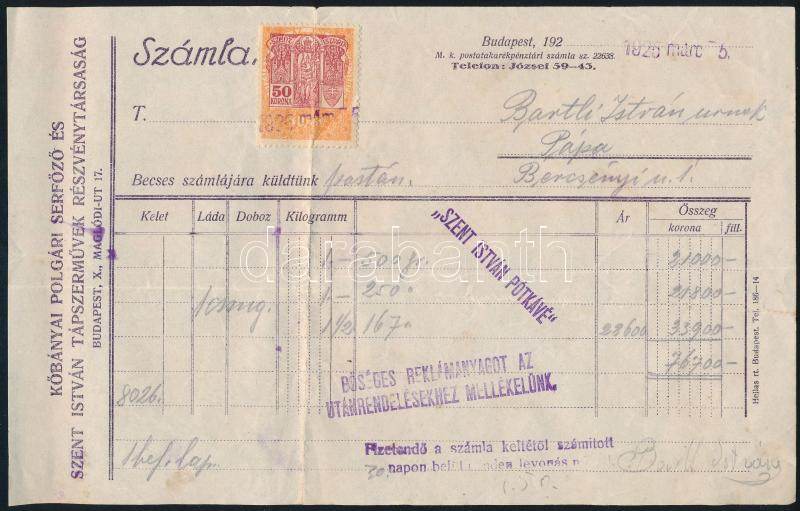 1925 Kőbányai Serfőző és Szent István Tápszerművek R.T. fejléces számla Szent István pótkávé tárgyában; rajta "Bőséges reklámanyagot az utánrendelésekhez mellékelünk." bélyegzés