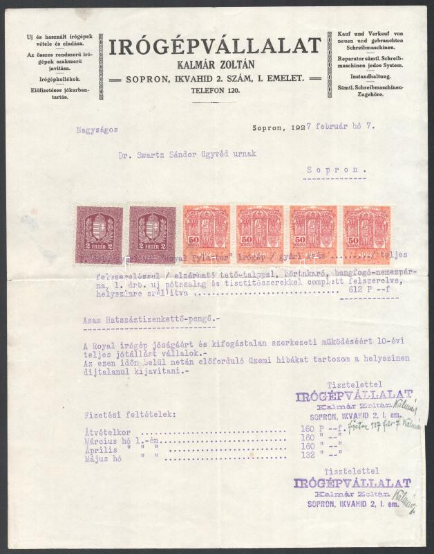 Leírás: 1927 Sopron Kalmár Zoltán írógép vállalat reklámos számla