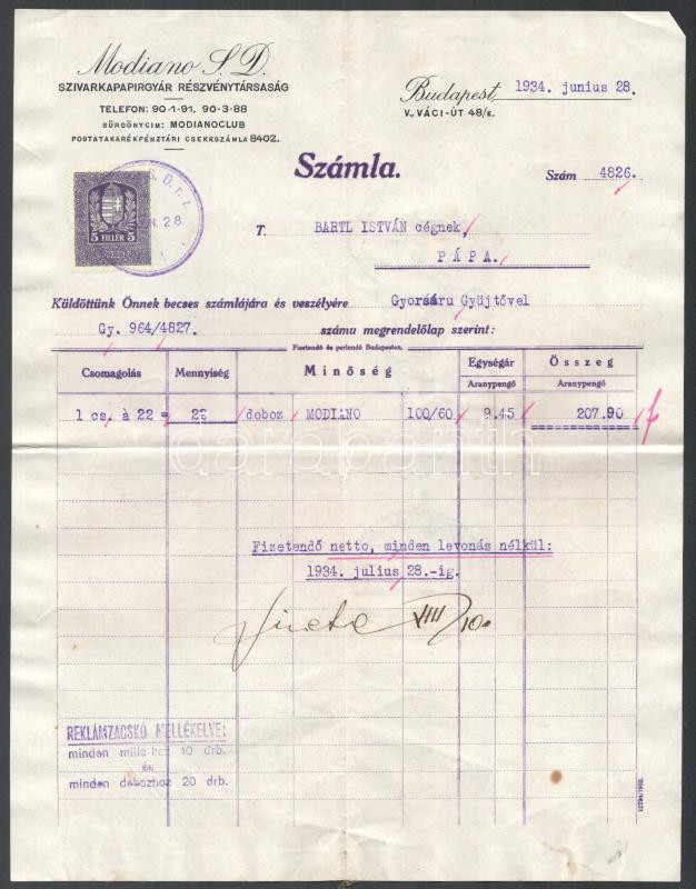 Leírás: 1934 Modiano Szivarkapapírgyár R.T. fejléces számla