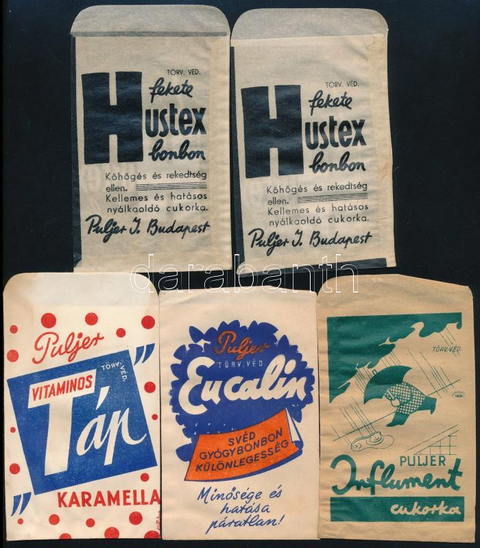 1935 5 db cukorka és bonbon tasak Puljer budapesti üzeméből https://www.darabanth.com/hu/471-Gyorsarveres/471.0/Mutargy-papirregiseg-egyeb/Reklam~1000006/1935-5-db-cukorka-es-bonbon-tasak-Puljer-budapesti-uzemebol~II3162514