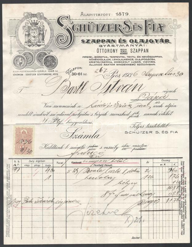 Leírás: 1936 Schützer S. és Fiai Szappan és Olajgyár, Pécs fejléces dekoratív számla