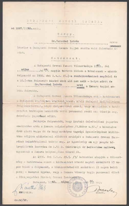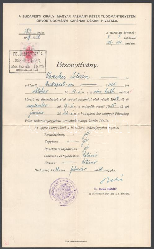 Leírás: 1938, 1940 A Budapesti Királyi Magyar Pázmány Péter Tudományegyetem Orvostudományi Karának bizonyítványa és az orvosi kamara határozata