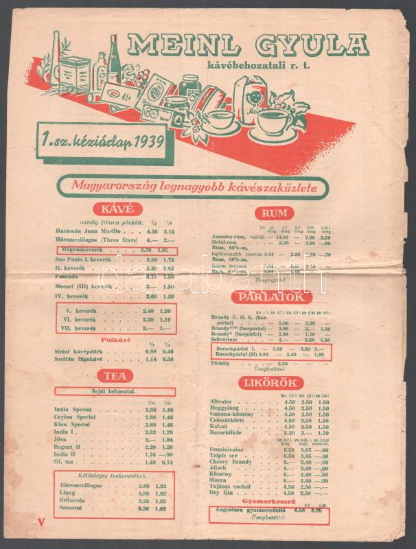 1939 Meinl Gyula Kávébehozatali R.T., 1. sz. kéziárlap, hajtott, kissé... https://www.darabanth.com/hu/471-Gyorsarveres/471.0/Mutargy-papirregiseg-egyeb/Reklam~1000006/1939-Meinl-Gyula-Kavebehozatali-RT-1-sz-keziarlap-hajtott-kisse-serult-foltos-2-sztl~II3185992