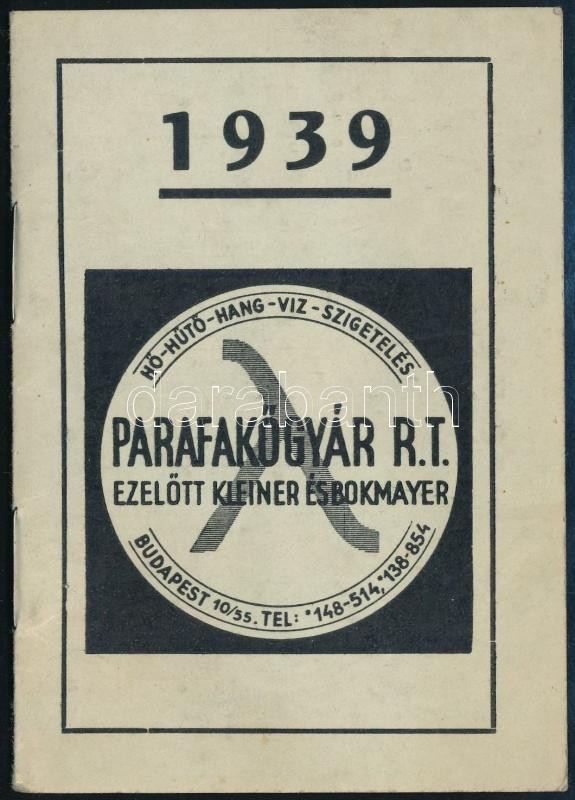 Leírás: 1939 Parafakögyár Bp. termékismertetője naptárral és árlistával, 12 számozatlan oldal, tűzött papírkötésben