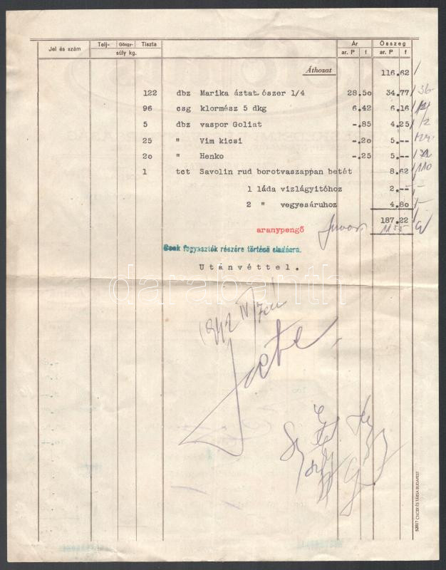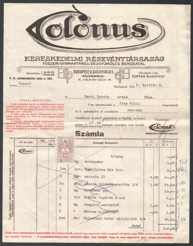 Leírás: 1942 Colonus Kereskedelmi R.T. fejléces számla, 2 oldalas