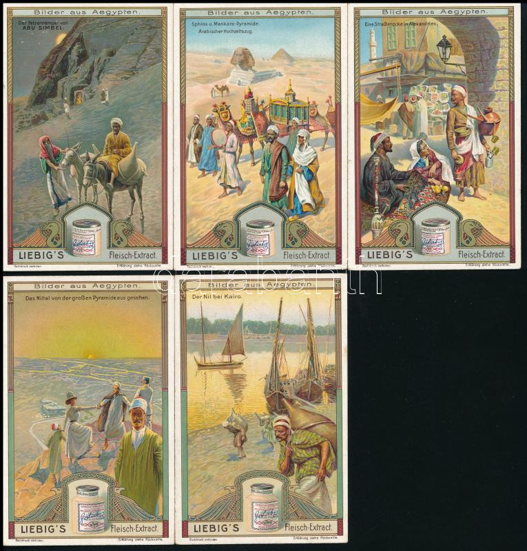 Leírás: 5 db húskonzervet reklámozó kártya egyiptomi litográf képekkel díszítve, 11×7 cm