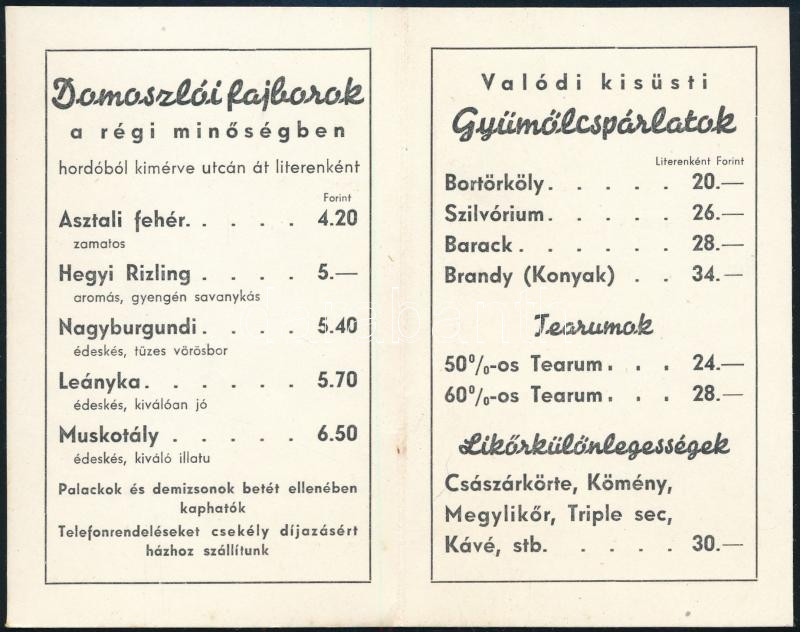Leírás: Domoszlói Italpince (Bp. II., Széna-tér 5.) ital árjegyzék, 2 sztl. lev.