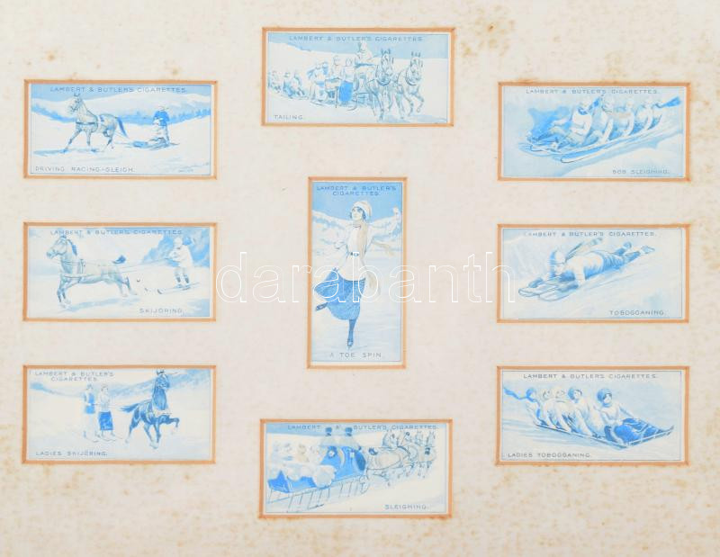Leírás: Lambert & Butler's Cigarettes, télisport témájú angol cigaretta-gyűjtőképek, 9 db, paszpartuban, üvegezett fakeretben, teljes méret: 27x33 cm