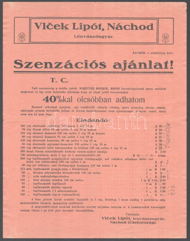 Leírás: cca 1910-1920 Vlcek Lipót szenzációs ajánlata arról, hogy egy csődbe jutott cég raktárkészletét 40%-kal olcsóbban árulja, 29×23 cm