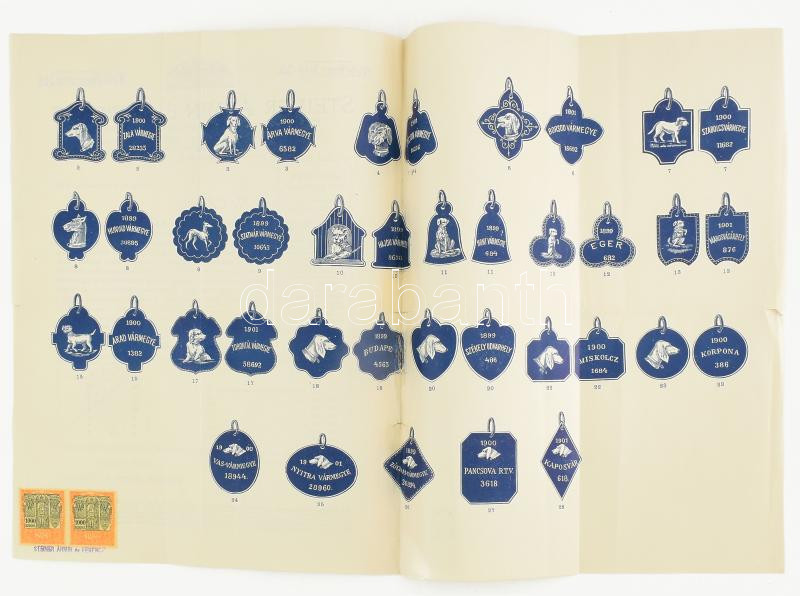 Leírás: cca 1910 Steiner Ármin és Ferenc ércárú gyárosok reklám nyomtatvány eb bárcák képeivel. 45x30 cm
