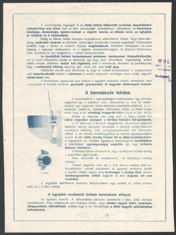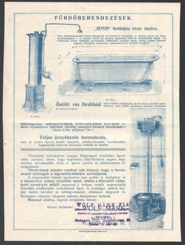 Leírás: cca 1910 Wolf Márk fürdőberendezések, szaniterek képes reklám nyomtatvány 2x2p.