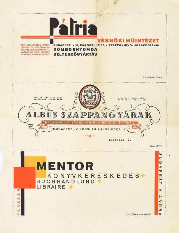 Leírás: cca 1920-1930 Pátria Vésnöki Műintézet / Albus Szappangyárak, Mentor Könyvkereskedés, reklámtervek, nyomat, szakadt, hajtott, foltos, a hátoldalán ceruzás bejegyzéssel, 30x23 cm