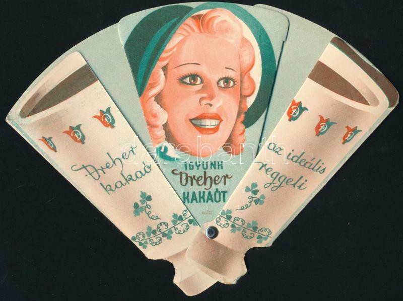 cca 1930 Dreher kakaó, Dreher keksz reklámos kihajtható legyező 24 cm https://www.darabanth.com/hu/471-Gyorsarveres/471.0/Mutargy-papirregiseg-egyeb/Reklam~1000006/cca-1930-Dreher-kakao-Dreher-keksz-reklamos-kihajthato-legyezo-24-cm~II3193320