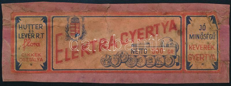 Leírás: cca 1930 Hutter és Lever R.T. flora Elekragyertya árucímke; m: 5x17cm; középen 1,5cm beszakadás