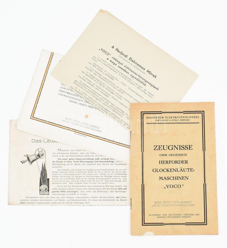cca 1930 össz. 4 db részben képes ismertető elektromos harangokról, közte 3 db német nyelvű, rajta Csepel-Budapest, Blaha János bélyegzőjével és 1 db magyar ny. ismertető, egyik borítója sérült