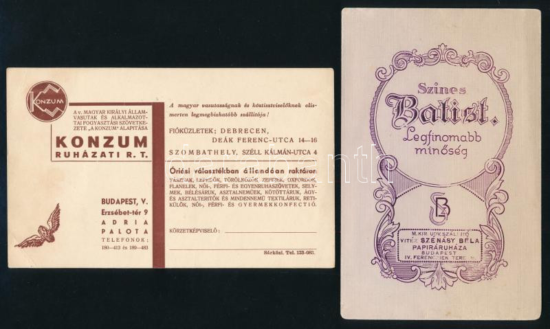 Leírás: cca 1940 Bp., 2 db ruházati témájú szórólap (vitéz Szénásy Béla, Konzum Ruhézati Rt.)