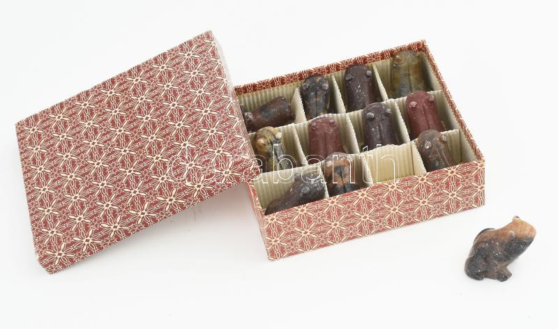 Leírás: 12 db kínai jáde béka figura, eredeti dobozában, egyenként 3,5 cm
