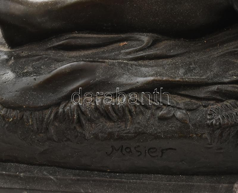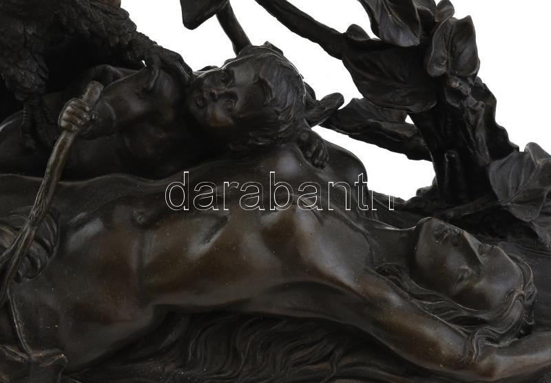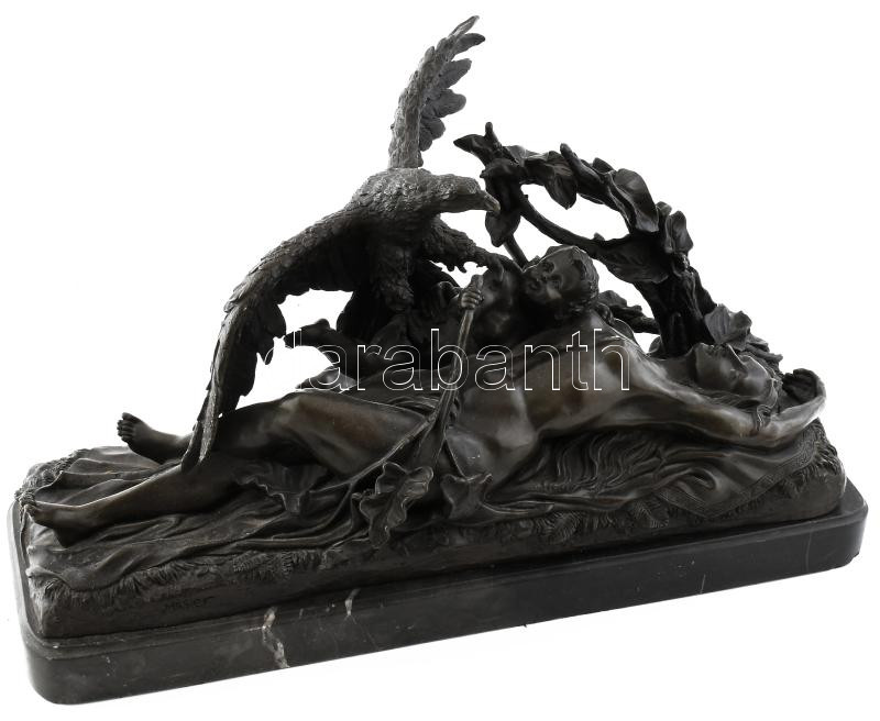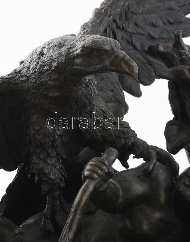 Jean Pierre Masier (1878-1957) francia szobrász: Nő gyermekkel és sassal. Patinázott bronz. Jelezve: Masier. Hibátlan, kopásokkal a talapzaton, 49x16x28 cm / Jean Pierre Masier (1878-1957): Woman with eagle and child. Patinated bronze. Signed. Faultless, with some crack in pedestal, 49x16x28 cm.
