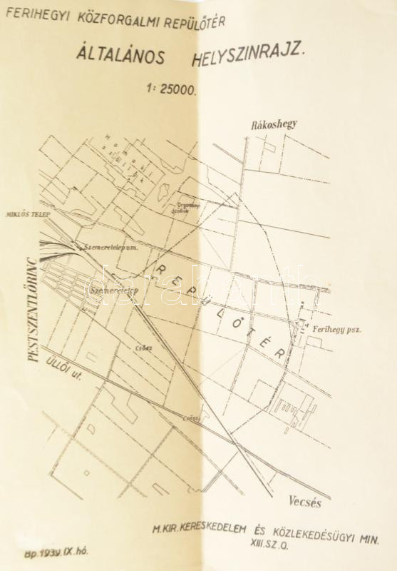 1939 Ferihegyi közforgalmi repülőtér általános helyszínrajza. 23x32 cm https://www.darabanth.com/hu/471-Gyorsarveres/471.0/Mutargy-papirregiseg-egyeb/Terkepek~1000011/1939-Ferihegyi-kozforgalmi-repuloter-altalanos-helyszinrajza-23x32-cm~II3145758