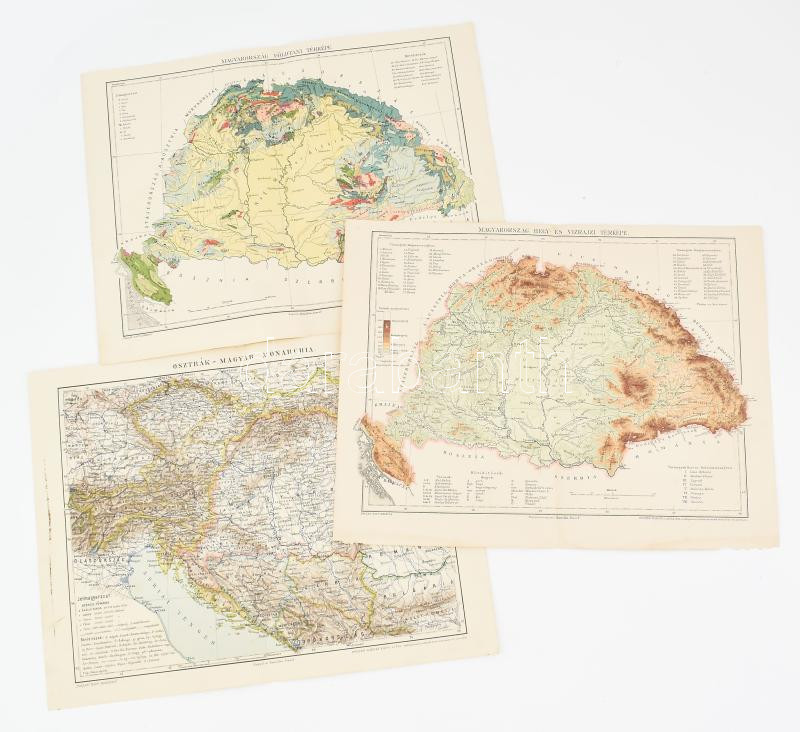 3 db térkép a Pallas Nagy Lexikonából: Az Osztrák-Magyar Monarchia térképe + Nagy-Magyarország földtani, ill. hegy- és vízrajzi térképe, rajzolta: Homolka József, Bp., Posner Károly Lajos és Fia, az egyiken kis lapszéli sérülésekkel, 23,5x30,5 cm