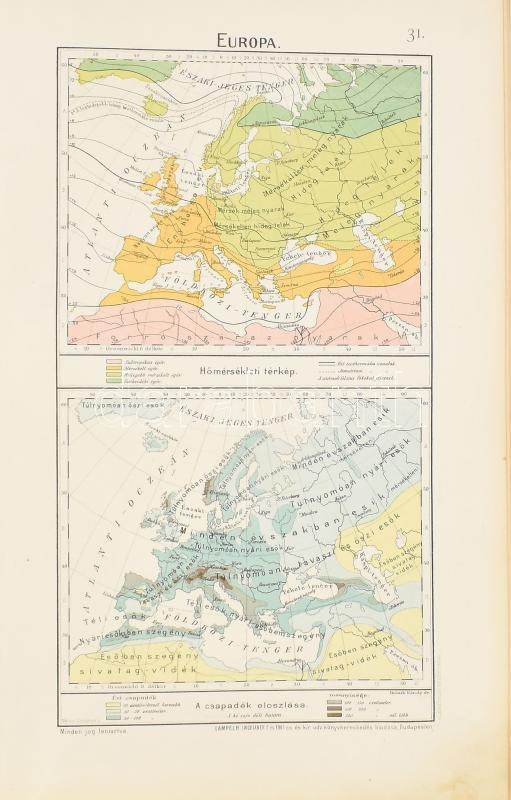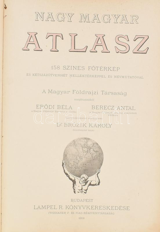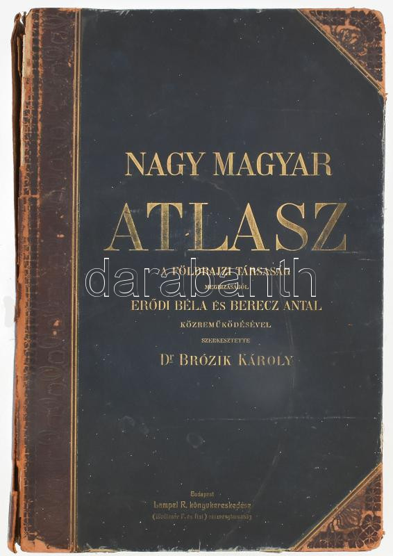 Dr. Brózik Károly (szerk.): Nagy magyar atlasz. 158 szÃnes fÅ‘térkép és kétszázötvenhét melléktérképpel és névmutatóval. A Magyar Földrajzi Társaság megbÃzásából, ErÅ‘di Béla és Berecz Antal közreműködésével szerk.: - - . Bp., 1906, Lampel R. (Wodianer F. és Fiai), (8) p.+ 158 t.+ 52 p. Kiadói aranyozott, szecessziós félbÅ‘r-kötés, Leszik-kötés, kissé viseltes, sérült, kopottas borÃtóval, sérült, elváló gerinccel, helyenként kissé foltos, koszos lapokkal.