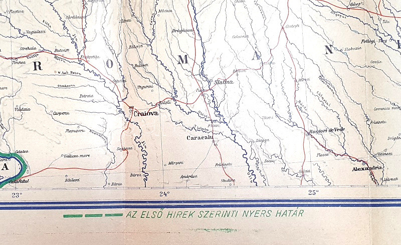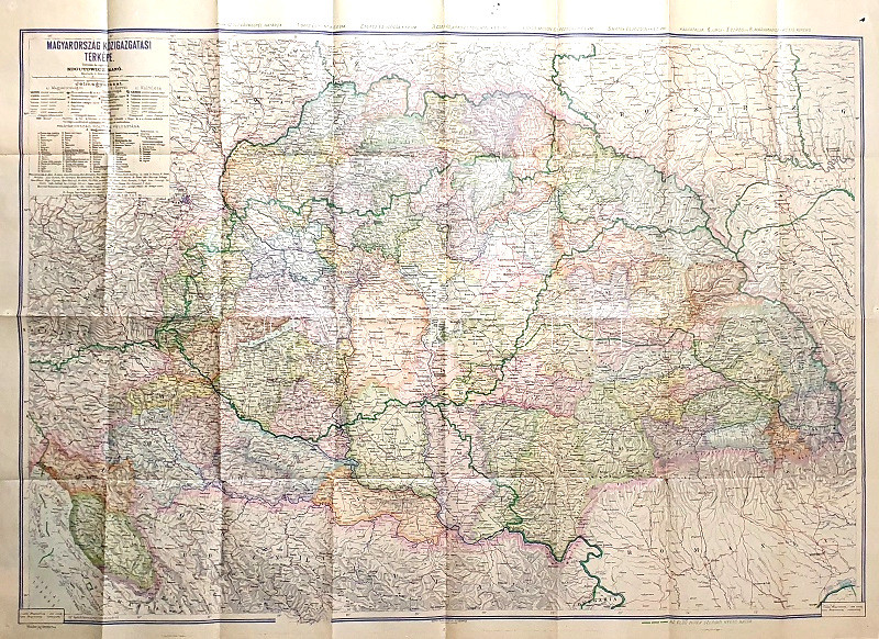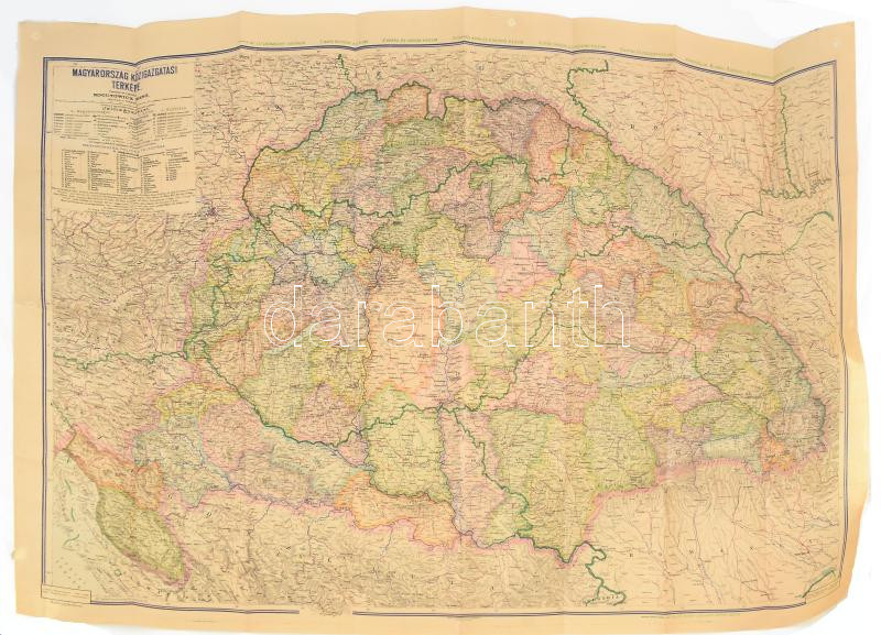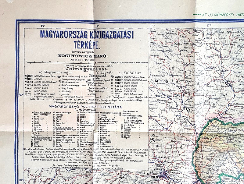 Magyarország közigazgatási térképe. Az első hírek szerinti nyers határ. A térképeredetit tervezte és rajzolta Kogutowicz Manó. Mérték: 1:900,000. (1940) Budapest, 1940. Magyar Földrajzi Intézet. Színes térkép, mérete: 735x1070 mm egy 840x1155 méretű térképlapon. Az első bécsi döntés (1938), a kárpátaljai bevonulás (1939) és az Észak-Erdélyt visszajuttató második bécsi döntés (1940) nyomán kialakult országhatárokat feltüntető közigazgatási térképünk Kogutowicz Manó térképésznek késő dualizmuskori Magyarországot ábrázoló rajzán alapszik. A domborzati, vízrajzi, közút-, vasút- és településhálózaton kívül a térképen feltűnnek a fontosabb hágók, várak, várromok és kastélyok. Térképünk színkódolt megyebeosztása a Trianont megelőző rendszer szerint, a Felvidék és Kárpátalja esetében az új, közigazgatásilag egyelőre egyesített vármegyék határainak felülnyomásával. Térképünkön a legfrissebb, észak-erdélyi határmódosulás kiemelten jól látható. A történelmi határokon túl térképünk valamennyi természetföldrajzi neve és településneve az államnyelv szokása szerint, a kivételt a Németország és Szovjetunió közös vállalkozásaként lerohant Lengyelország jelenti - az egykori lengyel területeken valamennyi felirat lengyel nyelvű. A térkép alsó sarkában a jól ismert jelmondat: Csonka-Magyarország nem ország / Egész Magyarország mennyország!" Jó állapotú térkép, hajtogatva, a térkép verzóján az egykori mappa hátsó borítója. Jó példány.