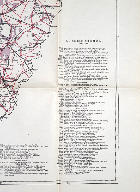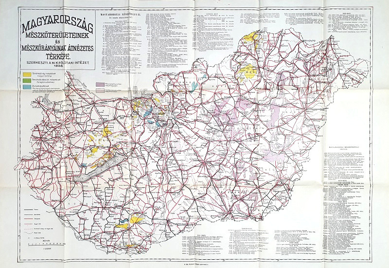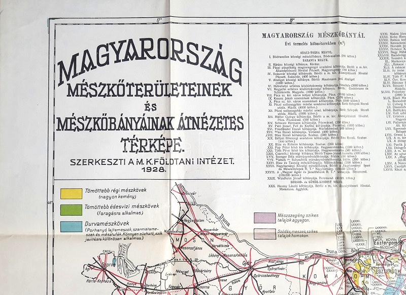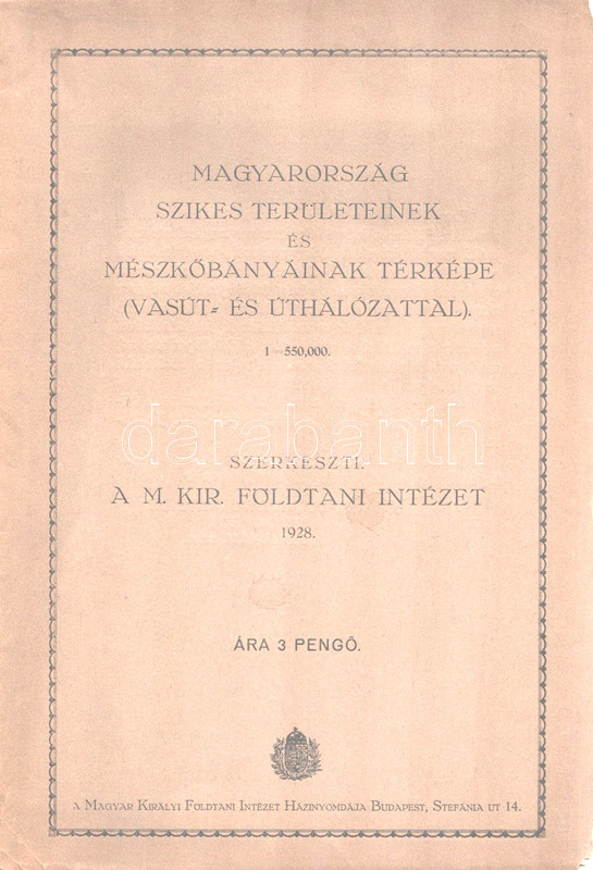 Magyarország szikes területeinek és mészkőbányáinak térképe (vasút- és úthálozattal). Mértéke: 1:550,000. (1928) Budapest, 1928. Magyar Királyi Földtani Intézet házinyomdája. Színes térkép, mérete: 630x900 mm egy 685x990 mm méretű térképlapon. A M. Kir. Földrajzi Intézet térképe a m. kir. Földmívelésügyi Minisztérium által megindított szikjavító (talajjavító) munkához kapcsolódik. A trianoni Magyarországot ábrázoló talajtani és kőzettani részleteket célzó térképen vízrajzi, település-, vasút- és közúthálózati részletek, a Hajdúság, a Nagykunság és a Körös-Maros köze mészszegény szikes, a Nyírség és a Kiskunság szódás szikes területeinek jelölésével, valamint hegységeink mészkő-lelőhelyeinek feltüntetésével. A térkép szélein Magyarország üzemelő 172 mészkőbányájának megnevezésével, az éves termelés adatolásával. Térképünk feliratozott borítóban, az első borító elvált a térképtesttől. Jó állapotú lap, hajtogatva, feliratozott kiadói borítóban. Jó példány.