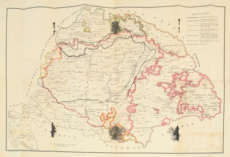 cca 1919-1920 Magyarország térképe az I. világháború után, a trianoni békeszerződést megelőzően, ideiglenesen kijelölt határokkal, Bp., Kellner és Mohrlüder-ny., foltos (tintafoltokkal), 58,5x94 cm