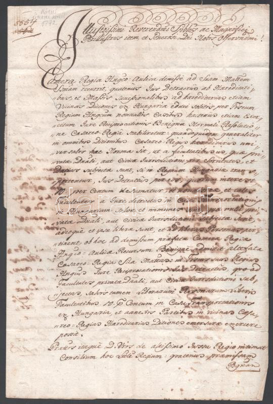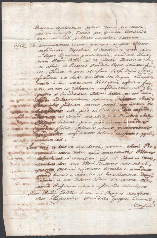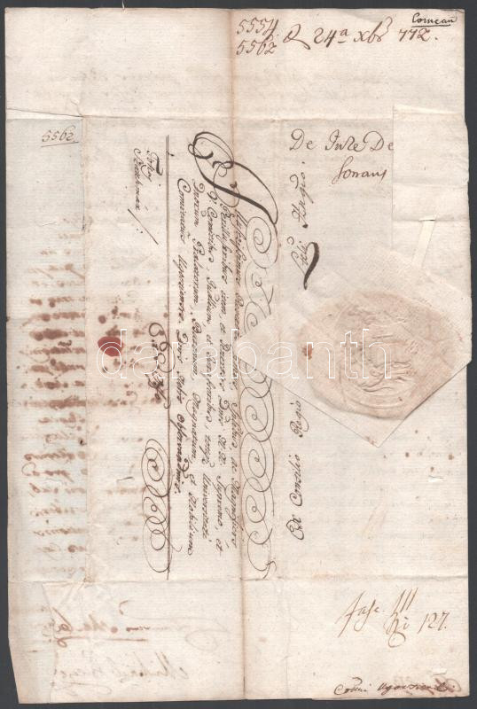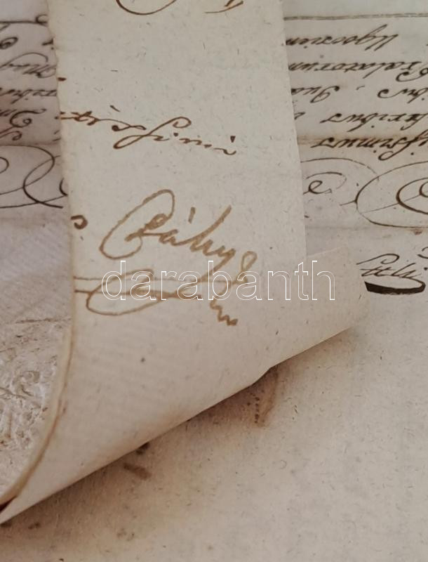 1772 gr. Csáky János (1720-1795) Szepes vármegye főispánja, későbbi országbíró, főtárnokmester, saját kézzel aláírt levele, latin nyelven, az aláírás vágott, a családi név külön a viaszpecséthez rögzítve